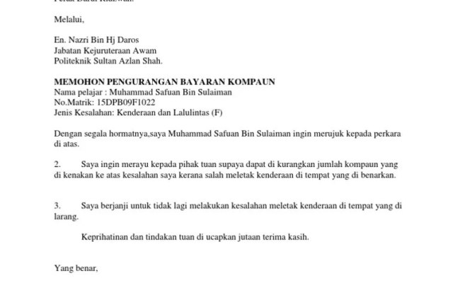 Surat rasmi rayuan pengurangan kompaun rasmi ri. Contoh surat rayuan untuk bayaran ansuran sample site i cute766. Surat rayuan pengurangan kompaun majlis perbandaran.
